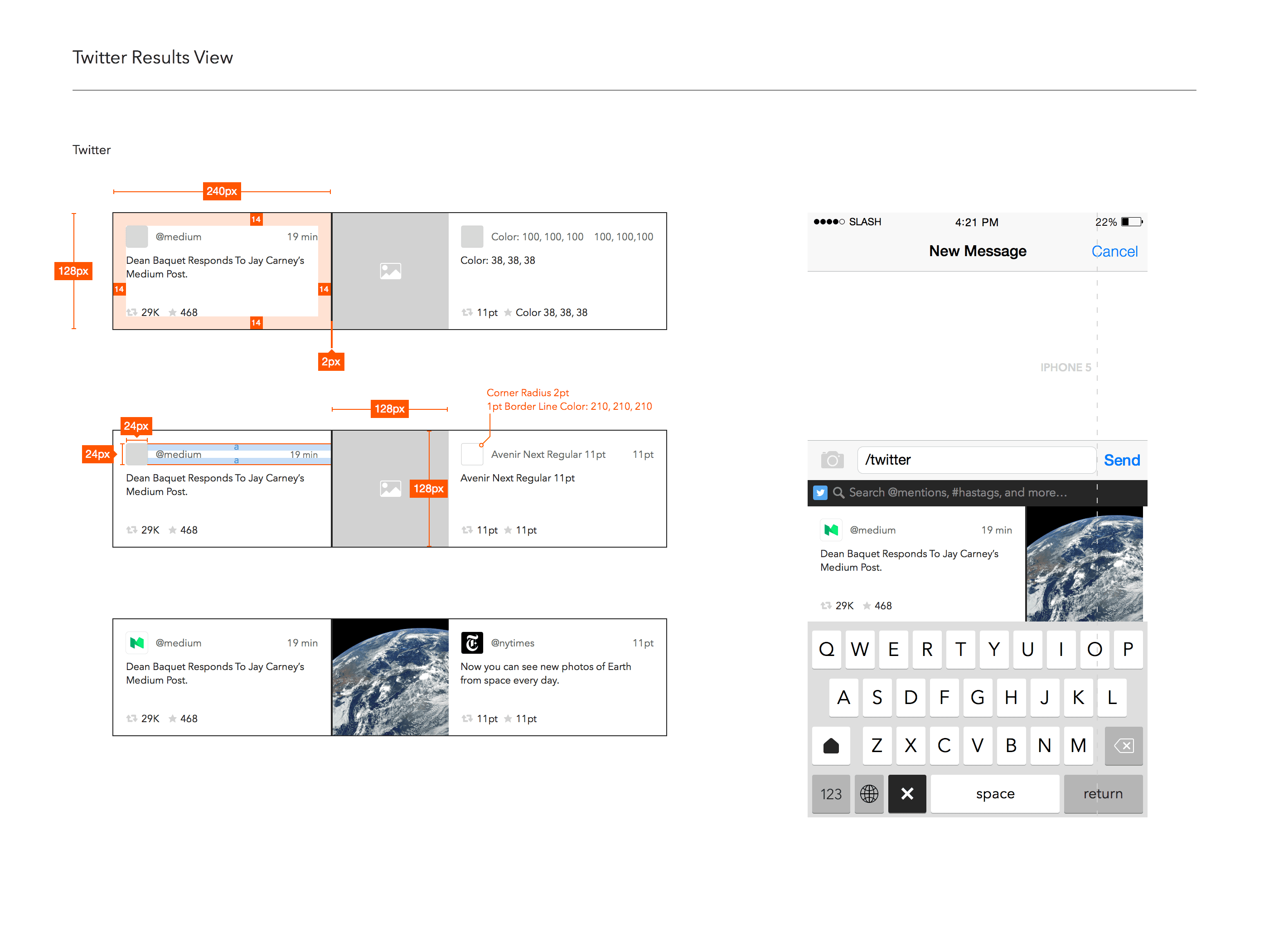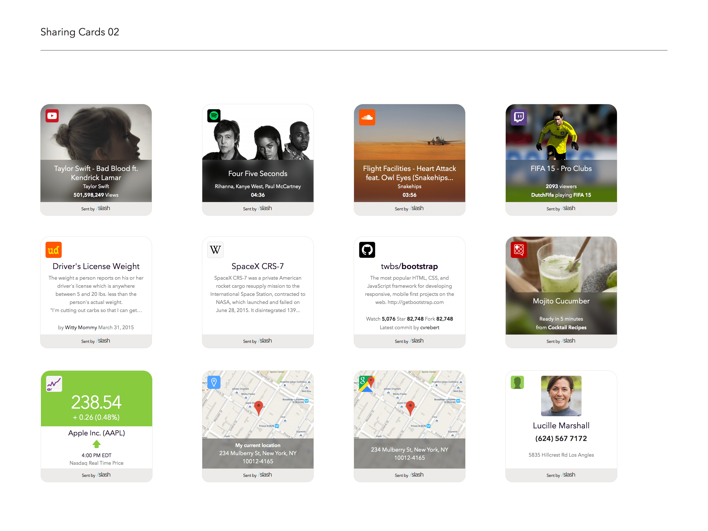 Slash is a custom keyboard that makes it easy to share anything without switching apps. Just tap "|" to unlock tons of your favorite services like Foursqaure, Spotify, Youtube, GIFs, Stickers, & more.